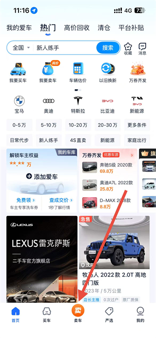 1、打開二手車之家APP,在底部導(dǎo)航欄找到賣車選項(xiàng)并點(diǎn)擊,進(jìn)入賣車服務(wù)頁(yè)面。