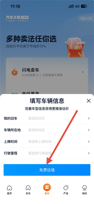 3、進(jìn)入填寫車輛信息界面,依次完善信息,然后點(diǎn)擊免費(fèi)估值即可獲取車輛估價(jià)。