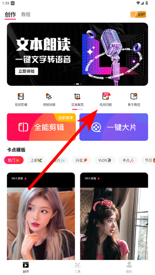 1、打開愛剪輯應(yīng)用,在創(chuàng)作界面點(diǎn)擊視頻同框選項(xiàng)。