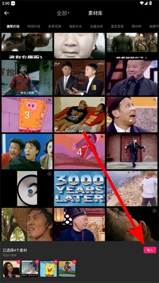 2、進(jìn)入素材選擇頁面,從相冊(cè)中挑選想要同框的視頻素材,選好后點(diǎn)擊右下角的導(dǎo)入按鈕。
