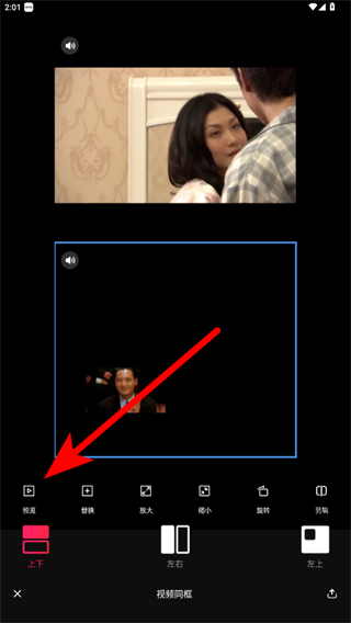 3、導(dǎo)入素材后,進(jìn)入視頻同框編輯界面,在這里可以點(diǎn)擊查看效果,還能使用功能對(duì)視頻進(jìn)行調(diào)整,也可以選擇同框布局樣式。