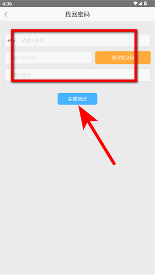 4、在找回密碼界面,依次信息后,點擊完成修改按鈕,即可重置密碼。
