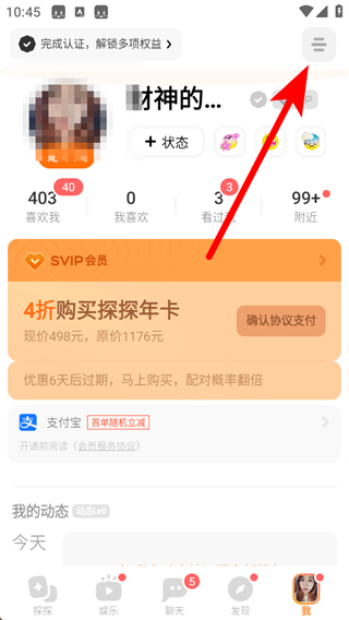 1、打開(kāi)探探APP,點(diǎn)擊右下角我,進(jìn)入個(gè)人頁(yè)面后點(diǎn)擊右上角三條橫線圖標(biāo)。