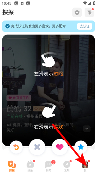 1、打開(kāi)探探App,點(diǎn)擊底部導(dǎo)航欄的我選項(xiàng),進(jìn)入個(gè)人頁(yè)面。