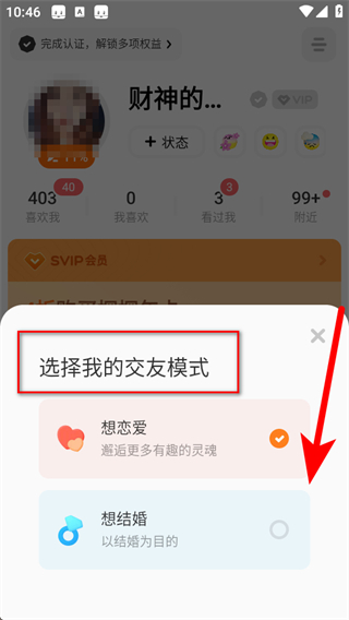 3、在選擇交友模式頁(yè)面中,根據(jù)需求選擇想戀愛(ài)或想結(jié)婚模式。