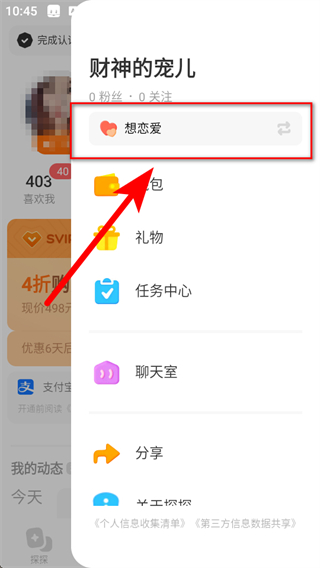 2、在彈出的菜單中點(diǎn)擊想戀愛(ài)選項(xiàng),進(jìn)入選擇交友模式頁(yè)面。