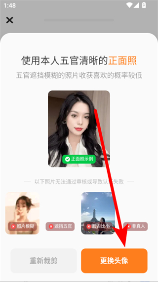 4、在提示頁(yè)面,點(diǎn)擊更換頭像按鈕,從手機(jī)相冊(cè)中選擇新的頭像圖片,完成更換后點(diǎn)擊完成即可。