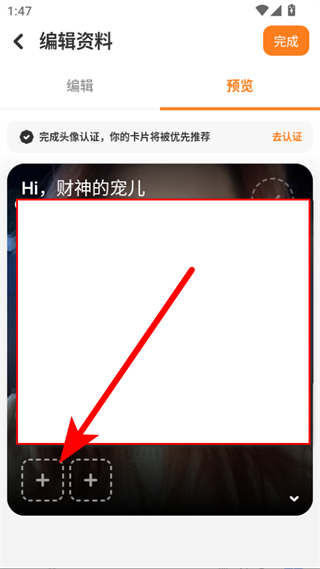 3、在編輯資料頁(yè)面,點(diǎn)擊頭像下方的加號(hào)按鈕,進(jìn)入頭像更換提示頁(yè)面。