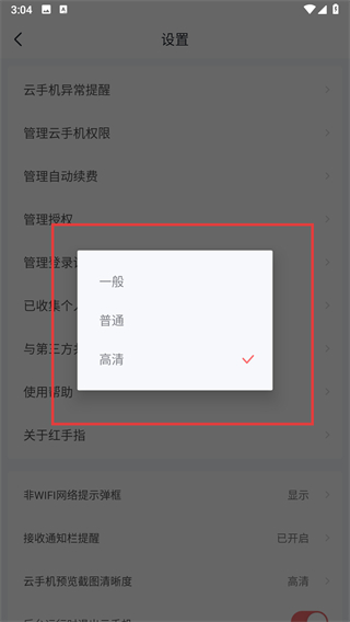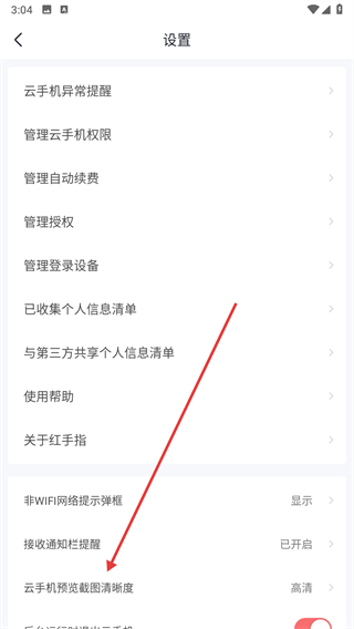3、在設(shè)置頁面,點擊云手機預(yù)覽截圖清晰度選項。