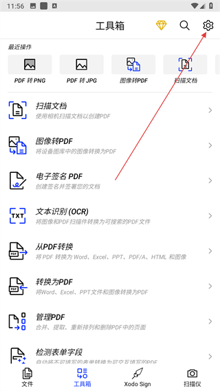 1、打開Xodo應用,進入工具箱界面,點擊右上角的設置圖標。