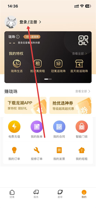2、在我的頁面,找到并點擊上方的登錄/注冊選項。