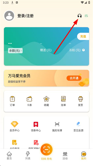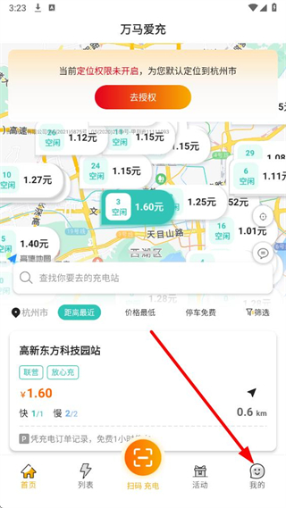 1、在萬馬愛充app首頁,點擊右下角我的按鈕,進入個人頁面。