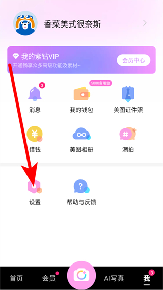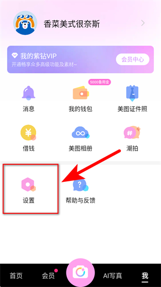 1、打開美顏相機APP,點擊右下角我,進入個人頁面后點擊設置。