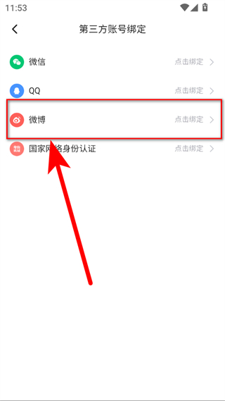 4、在第三方賬號綁定頁面點擊微博,按照提示完成微博賬號的綁定操作即可。