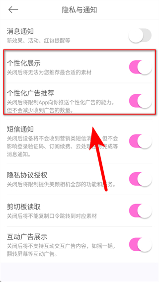 4、分別點擊個性化展示和個性化廣告推薦右側的開關按鈕,將其關閉即可關閉美顏相機的個性化推送。