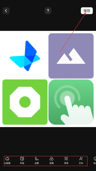 3、進(jìn)入拼圖編輯界面,可對拼圖的布局、邊框等進(jìn)行調(diào)整,調(diào)整完成后點(diǎn)擊右上角的保存按鈕。