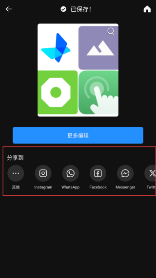 4、保存完成后,能通過分享到區(qū)域的各類平臺(tái)分享拼接好的圖片。