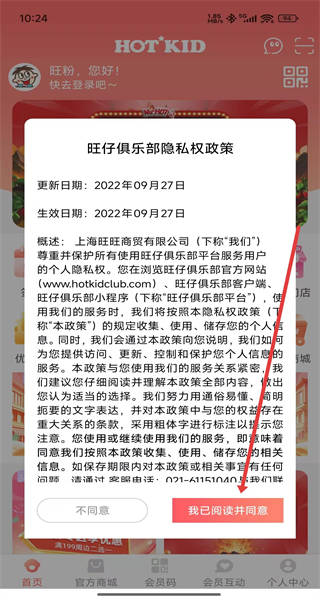 1、點擊“旺仔俱樂部隱私權(quán)政策”彈窗的“我已閱讀并同意”,進入旺仔俱樂部APP主界面。
