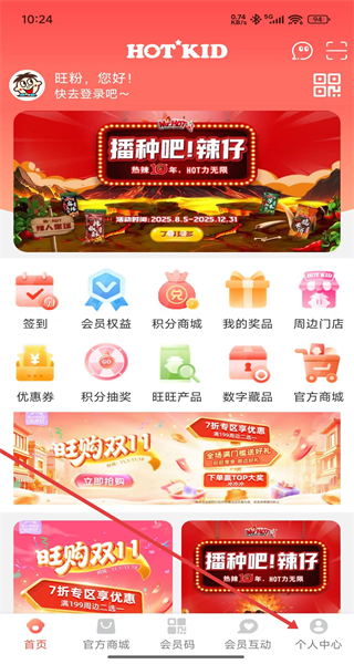 1、打開旺仔俱樂部app,進入首頁點擊底部導航欄最右側(cè)的個人中心選項,進入個人相關(guān)操作頁面。