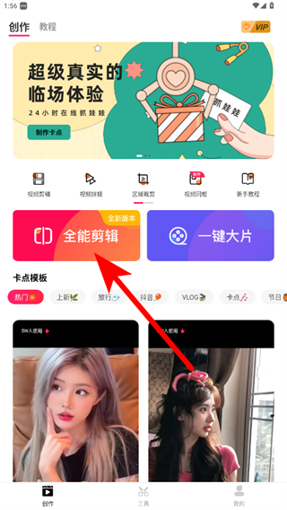 1、打開愛剪輯應(yīng)用,在創(chuàng)作界面點擊全能剪輯,進(jìn)入素材選擇頁面。