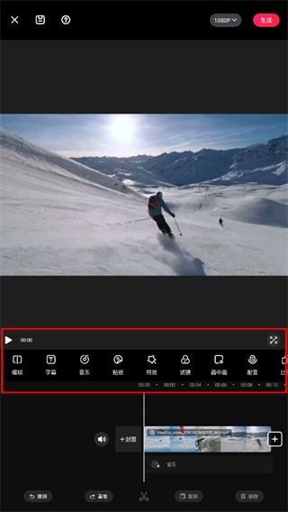 3、進(jìn)入視頻編輯界面,界面下方有豐富功能按鈕,點擊相應(yīng)按鈕,對視頻進(jìn)行裁剪、添加字幕、配樂、加特效等操作。