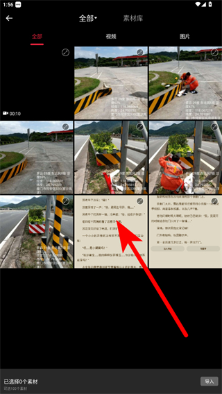 2、在素材選擇頁面,從手機(jī)相冊里選取要用于制作視頻的圖片或視頻片段,選好后點擊導(dǎo)入。