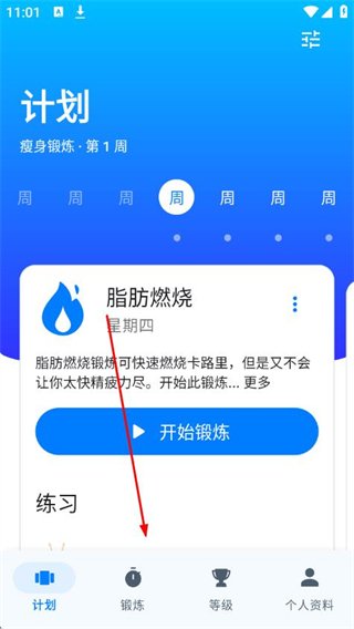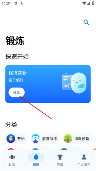 2、在鍛煉頁(yè)面點(diǎn)擊保持常新板塊的開始,進(jìn)入鍛煉項(xiàng)目選擇界面。