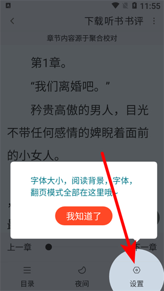 2、在小說(shuō)閱讀界面,點(diǎn)擊右下角設(shè)置選項(xiàng),彈出設(shè)置菜單。