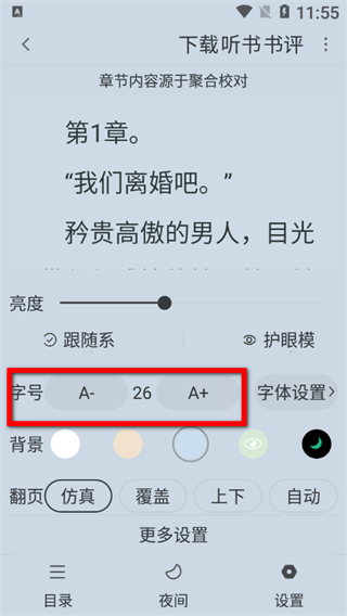 3、在設(shè)置菜單中,找到字號(hào)設(shè)置區(qū)域,通過(guò)A-、A+調(diào)整字體大小。