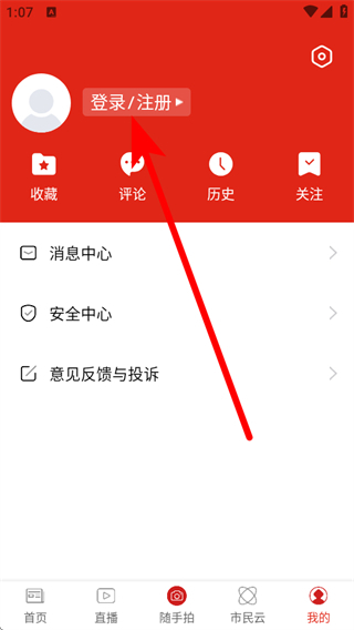 2、在個(gè)人界面,點(diǎn)擊登錄/注冊(cè)區(qū)域,進(jìn)入登錄頁面。