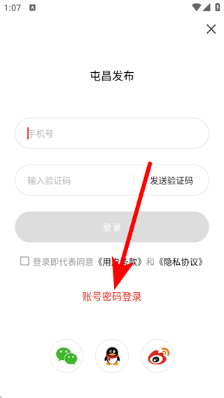 3、在登錄頁面,點(diǎn)擊賬號(hào)密碼登錄選項(xiàng),進(jìn)入密碼登錄界面。