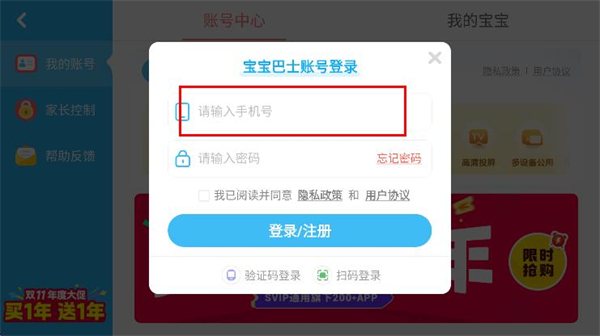 3、在寶寶巴士賬號登錄頁面,輸入手機號。