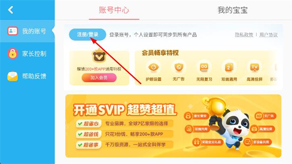 2、在賬號中心頁面中,找到并點(diǎn)擊下方注冊/登錄按鈕。