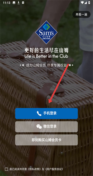 1、在山姆APP登錄頁(yè)面點(diǎn)擊“手機(jī)登錄”,進(jìn)入登錄界面。