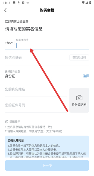 4、在實(shí)名信息填寫頁(yè)面依次對(duì)應(yīng)提示信息,完成后點(diǎn)擊“下一步”,即可完成山姆會(huì)籍的購(gòu)買操作。