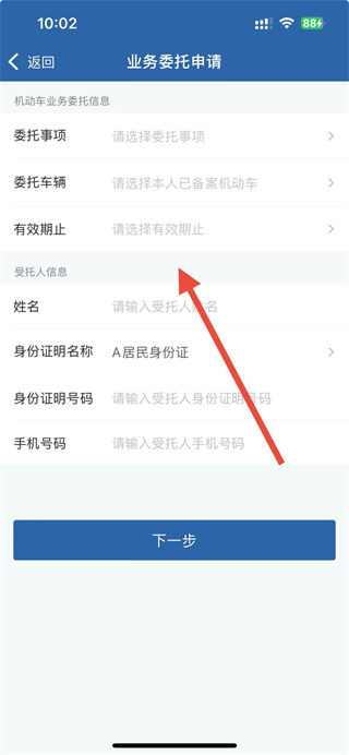 4、填寫信息內(nèi)容后,點擊下一步按照提示完成業(yè)務(wù)委托申請操作即可。