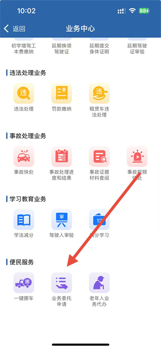 2、在業(yè)務(wù)中心的便民服務(wù)板塊,點擊業(yè)務(wù)委托申請選項。