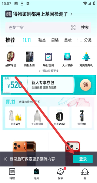 1、在得物首頁中,點(diǎn)擊下方登錄按鈕,跳轉(zhuǎn)到登錄頁面進(jìn)行登錄操作。