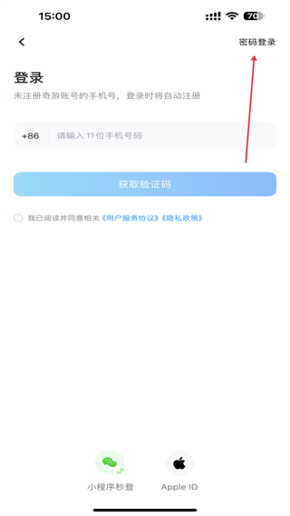 3、進(jìn)入登錄的界面內(nèi),點(diǎn)擊右上方密碼登錄的按鈕。