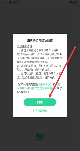 1、打開會(huì)玩APP,彈出用戶協(xié)議與隱私政策窗口,點(diǎn)擊同意按鈕后進(jìn)入。