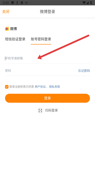 4、在微博登錄頁面,輸入手機(jī)號(hào)或郵箱以及密碼,點(diǎn)擊“登錄”按鈕,完成賬號(hào)登錄流程。
