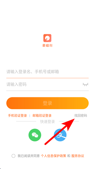 1、打開最福利APP,在登錄頁面點擊找回密碼,進入重置密碼頁面。