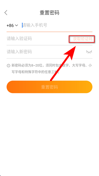 2、在重置密碼頁面,輸入手機號,點擊獲取并輸入驗證碼。