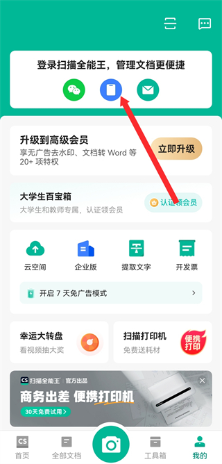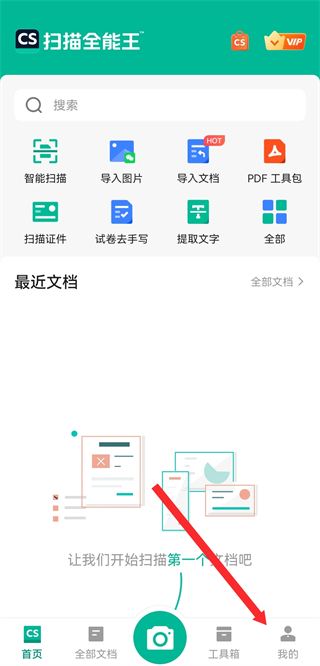 1、打開掃描全能王APP,點(diǎn)擊右下角我的,進(jìn)入個(gè)人頁面。