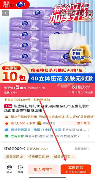 1、打開該購物APP,在首頁找到維達(dá)抽紙商品,點(diǎn)擊進(jìn)入商品詳情頁。