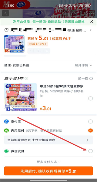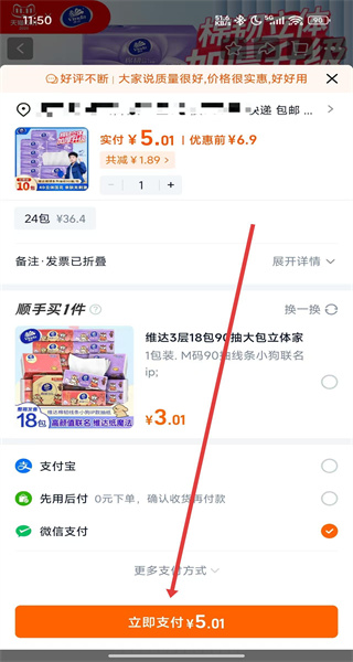 3、在訂單支付頁面選擇支付方式如微信支付。