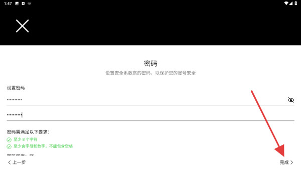4、進入到設置密碼的頁面內,輸入兩次相同的密碼后,點擊完成的按鈕即可。