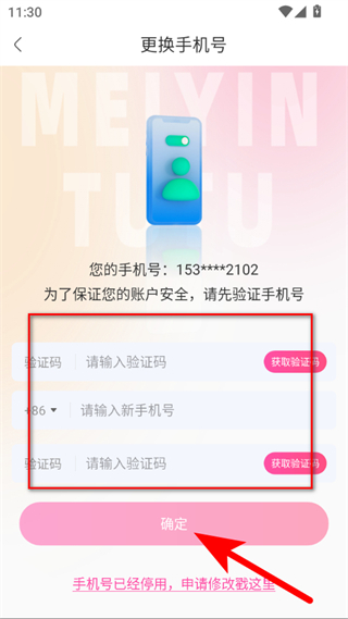5、進(jìn)入更換手機(jī)號(hào)頁面后,輸入原手機(jī)號(hào)驗(yàn)證碼、新手機(jī)號(hào)及新手機(jī)號(hào)驗(yàn)證碼,點(diǎn)擊確定,即可完成換綁操作。