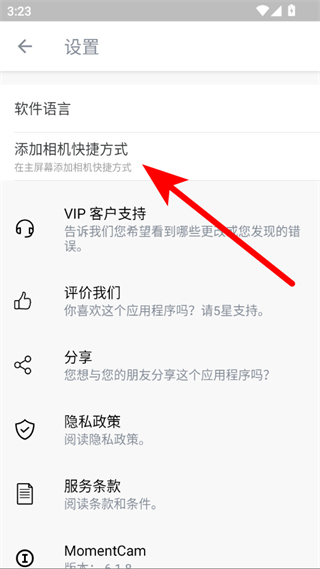 2、在設(shè)置頁面點(diǎn)擊添加相機(jī)快捷方式選項(xiàng)。