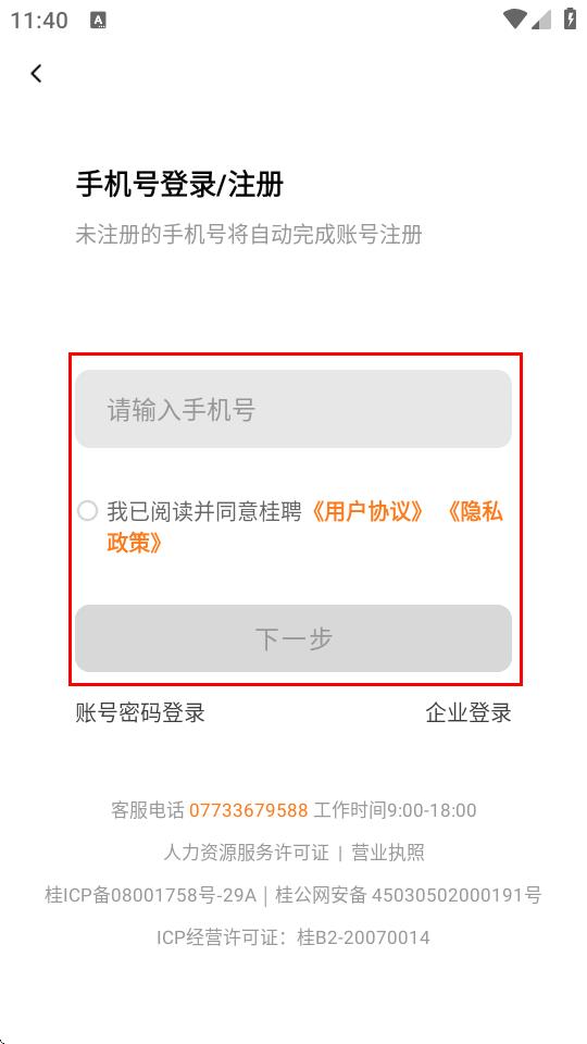 3、進入手機號登錄/注冊頁面,輸入手機號,勾選同意用戶協(xié)議和隱私政策,點擊下一步。